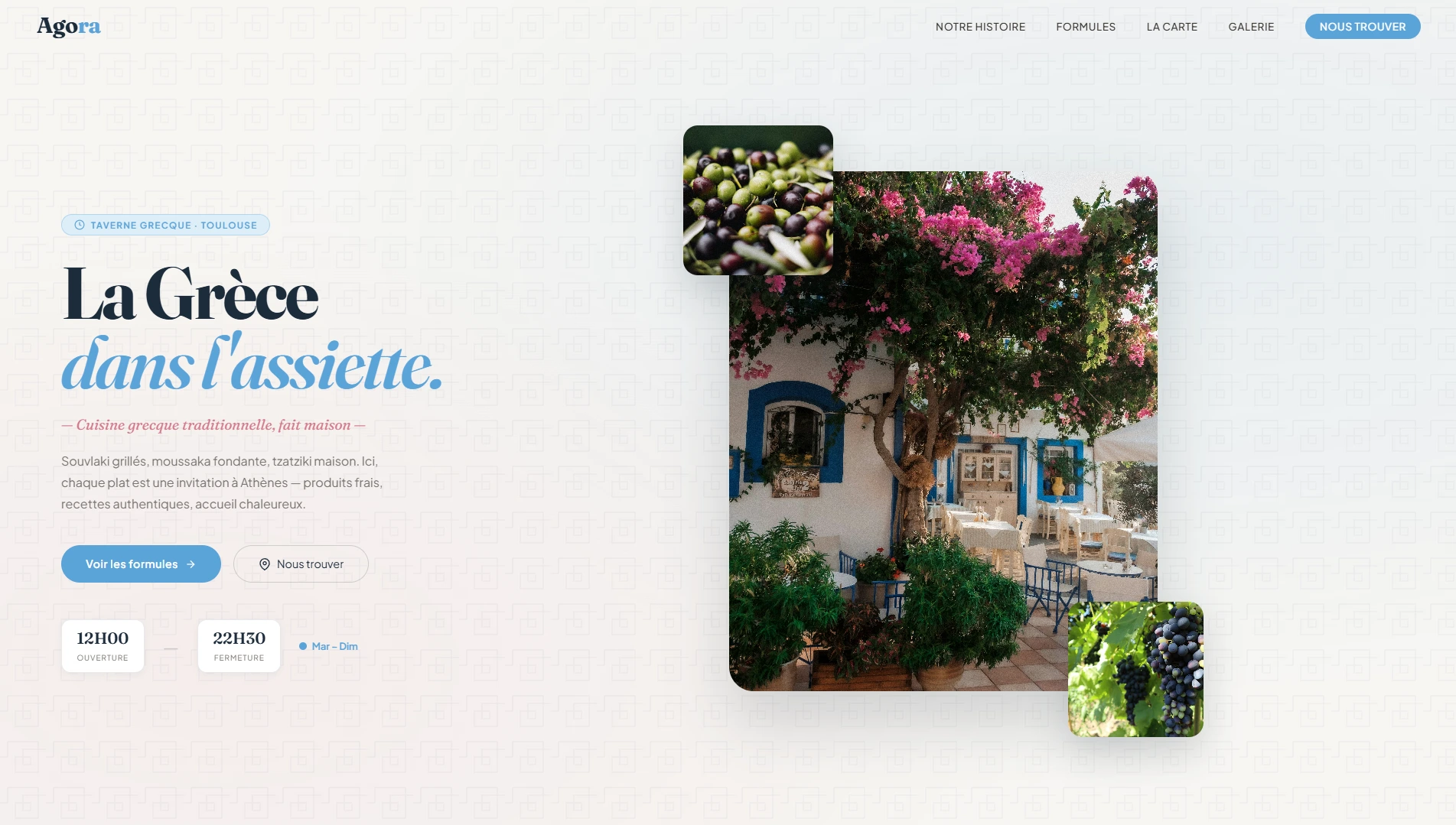 Un site vitrine pour un restaurant grec, conçu pour afficher les menus, les plats et leur façon de faire.