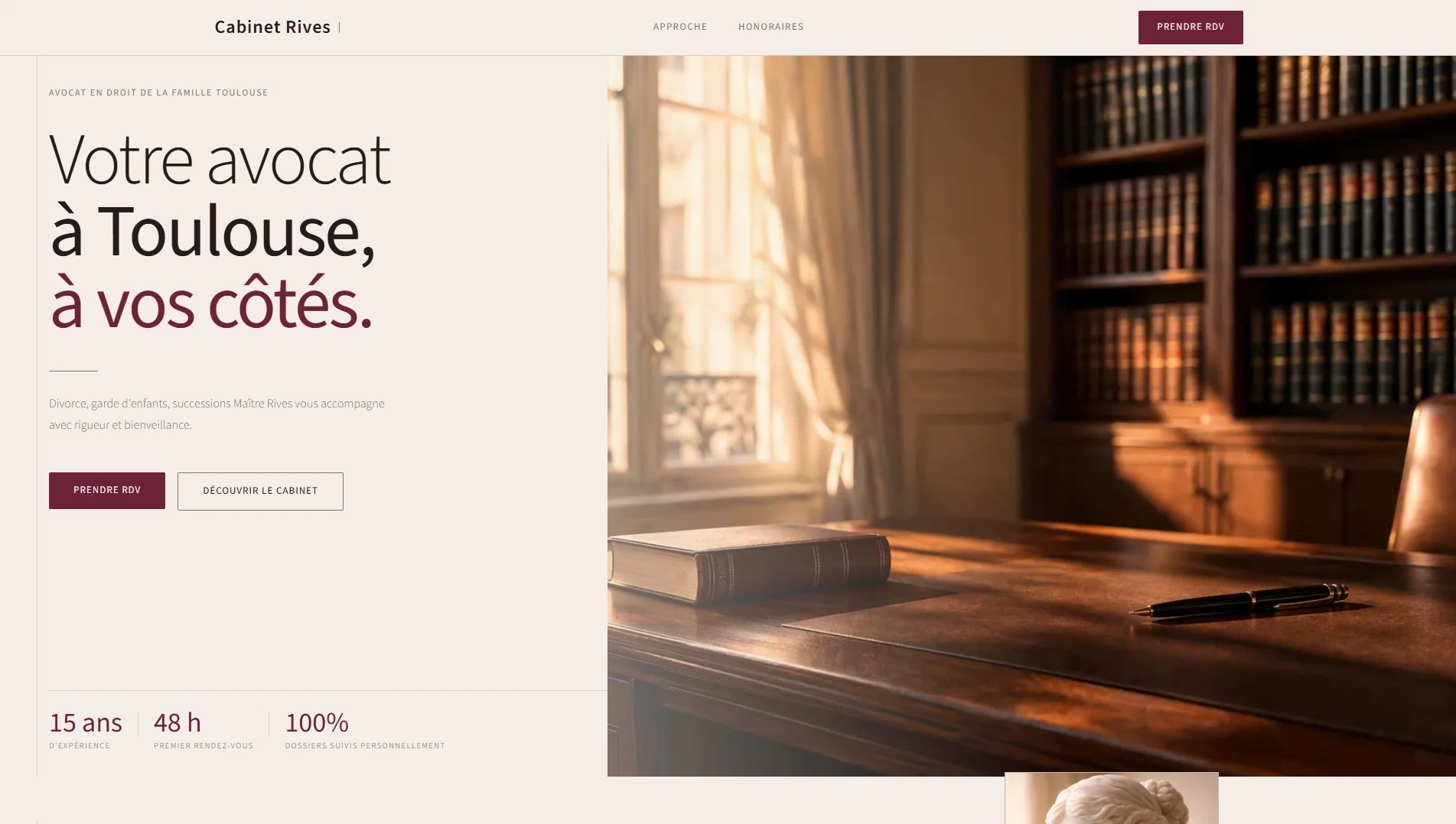 Cabinet Rives est un projet fictif conçu pour illustrer la création d'un site vitrine pour une avocate indépendante. L'objectif était de concevoir une identité en ligne sobre et professionnelle.